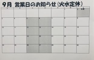 9月営業日のお知らせ🗓 9月は火水定休となります🌰 2日(土)は臨時…